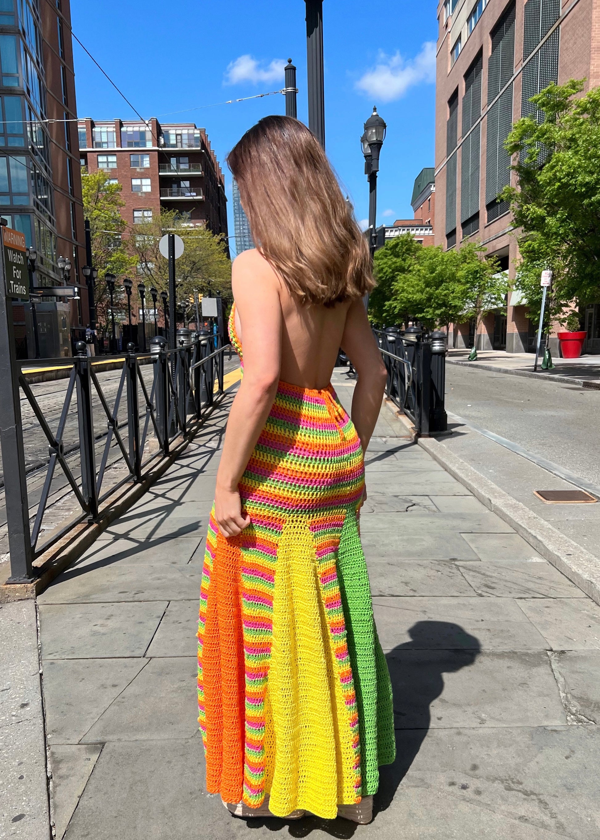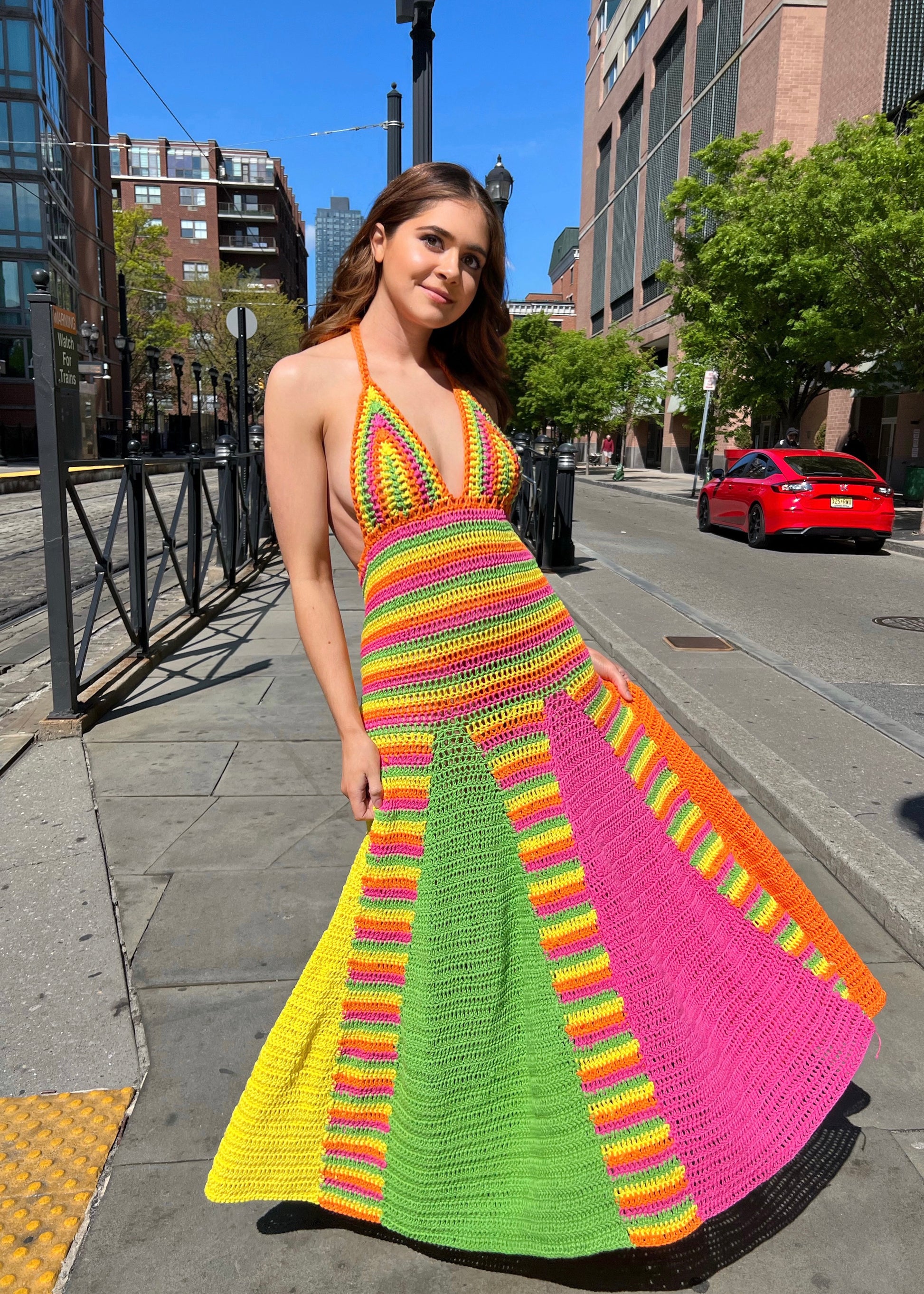 The Aires Dress is a fabulous striped crochet maxi dress with flowy skirt and adjustable straps. Mix and match colors to create the perfect look for you!