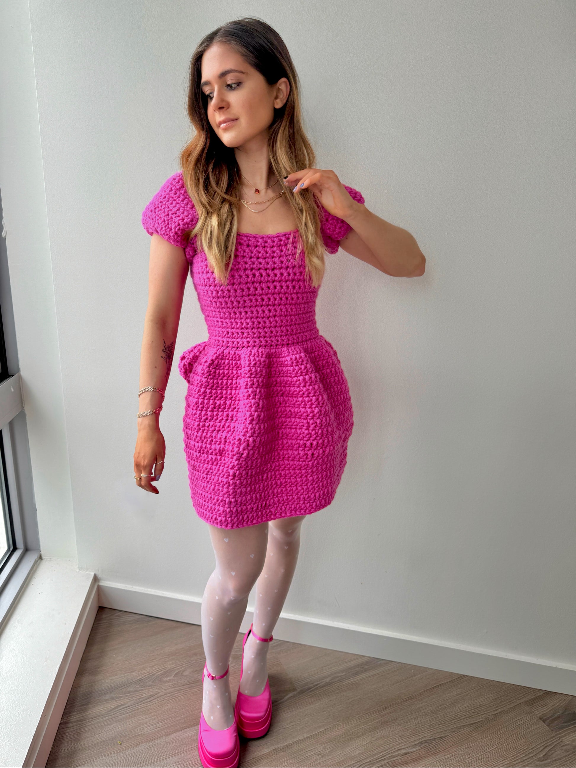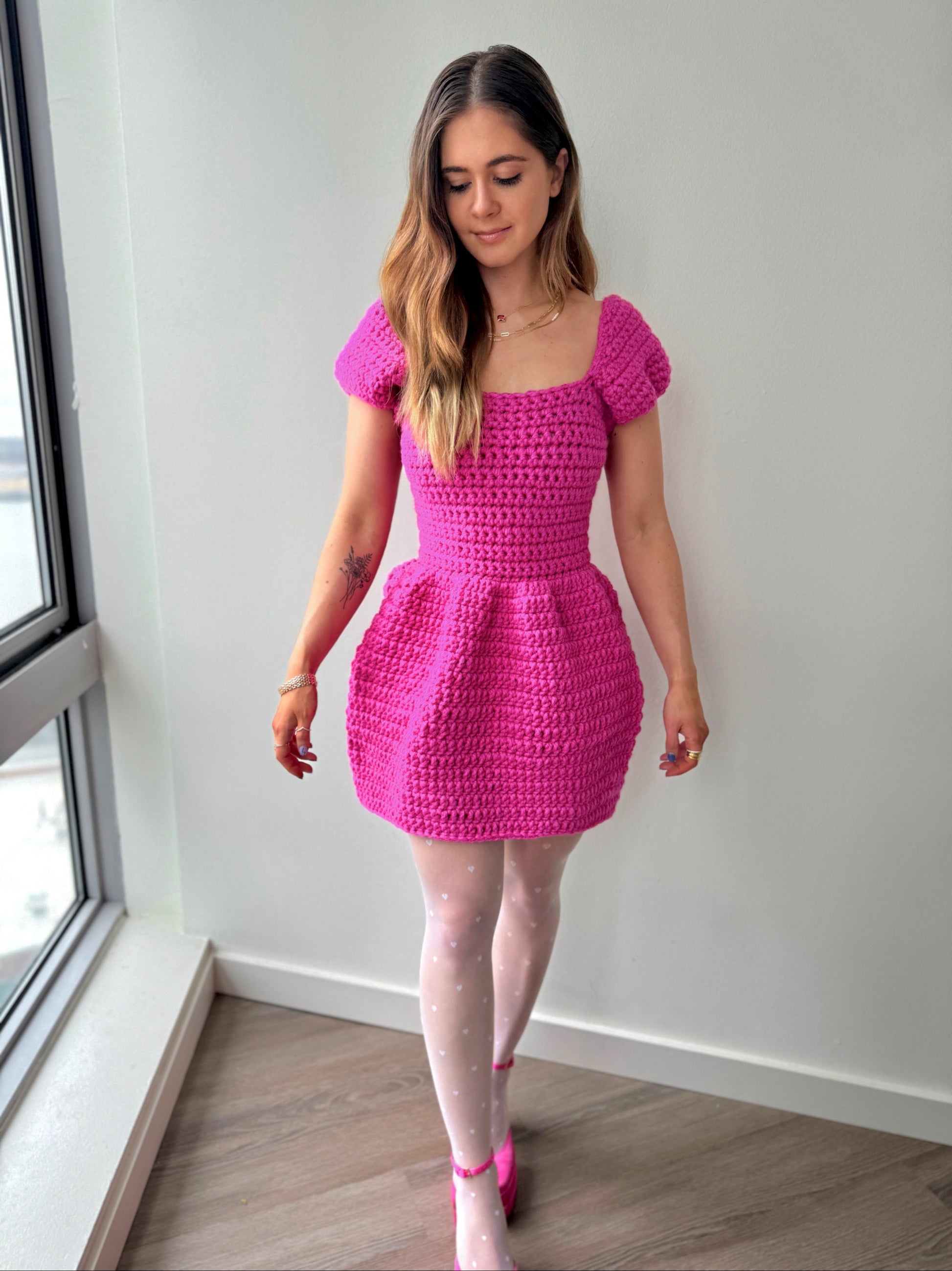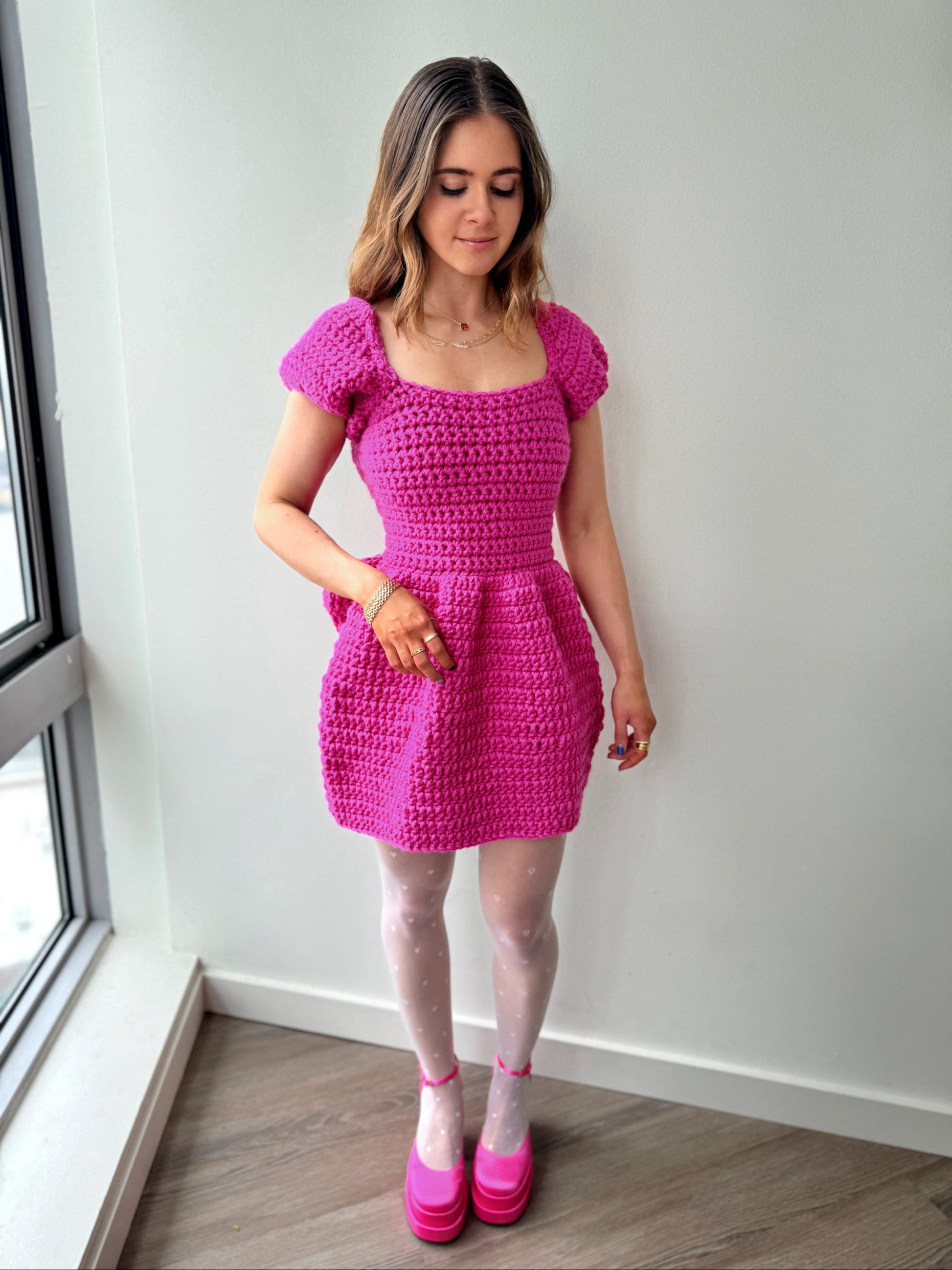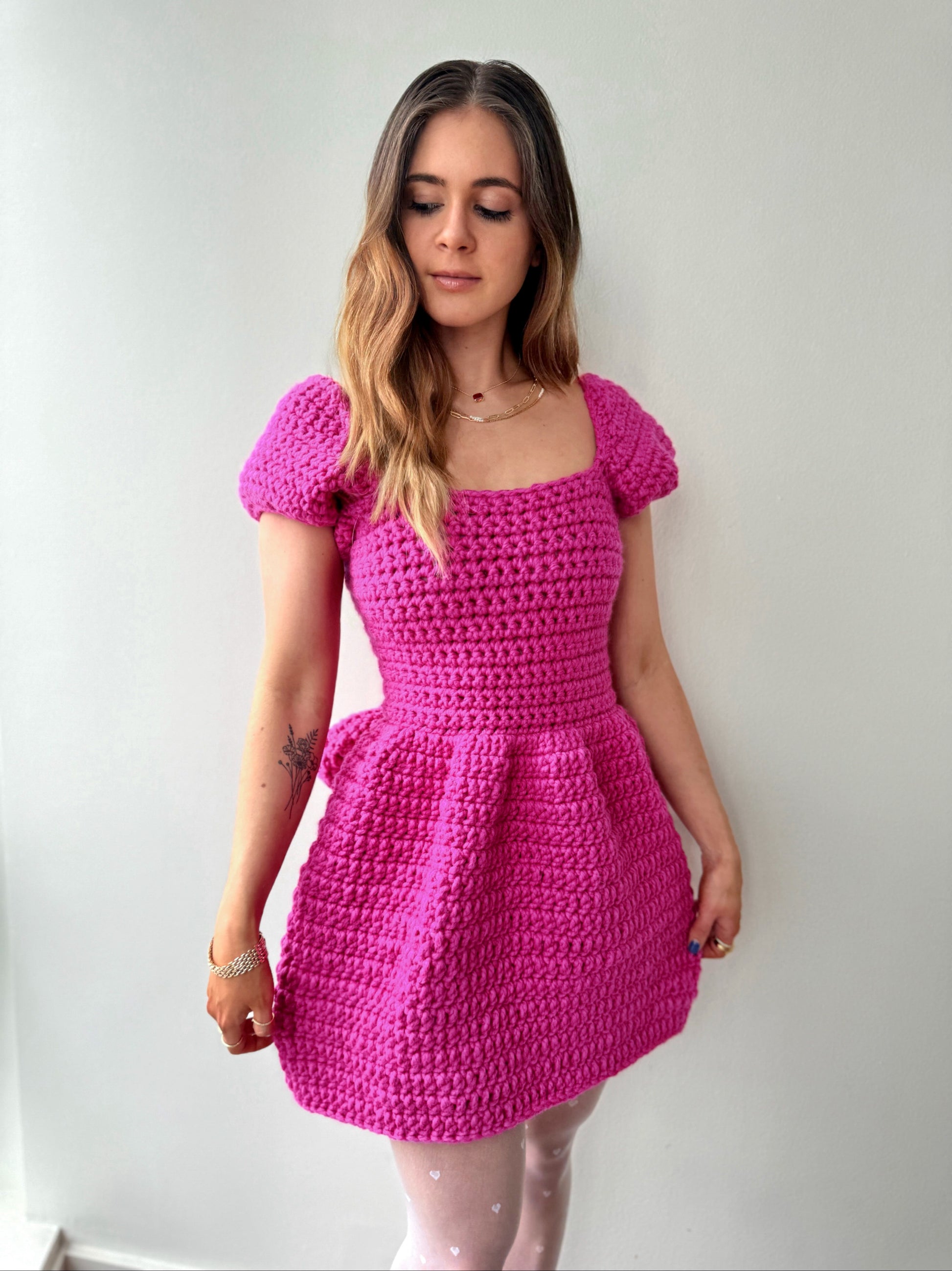 The Aurelle Dress is a stunning structured crochet babydoll dress with puffy sleeves and a big bow detail. The perfect statement dress for your crochet wardrobe!