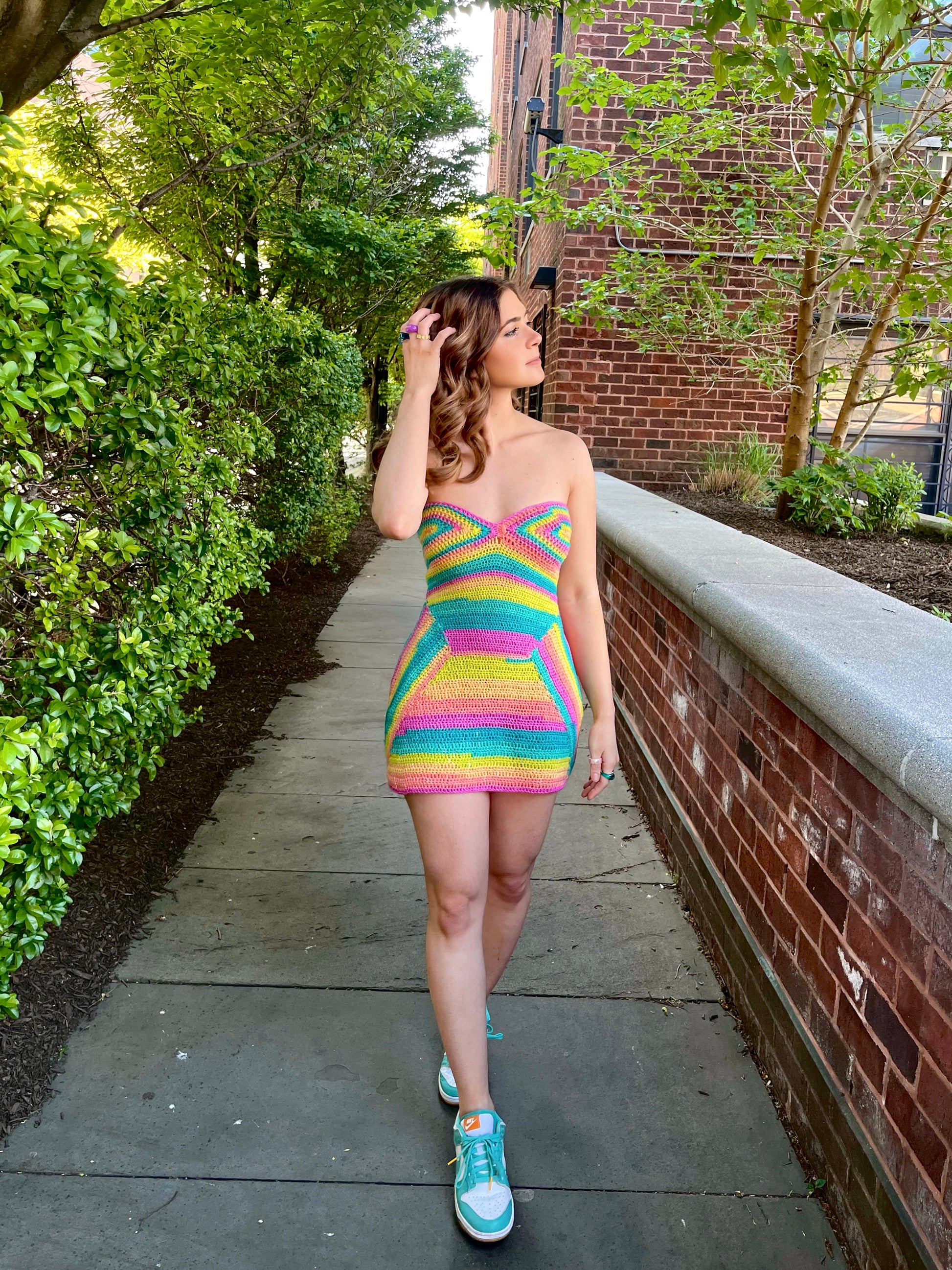 The Cabo Dress is a cute and colorful strapless crochet mini dress with unique striping details.