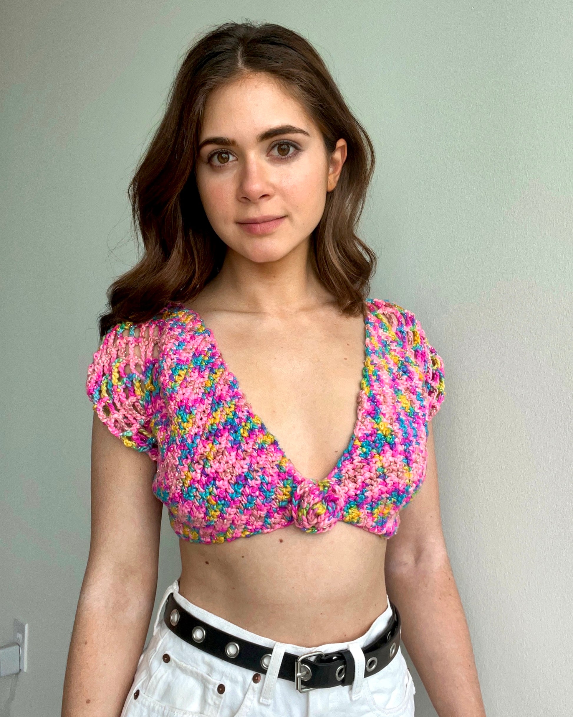 O Bogota Top é um cropped de crochê lindamente colorido com um lindo aplique de flor e alças ajustáveis. Um ótimo top para iniciantes!
