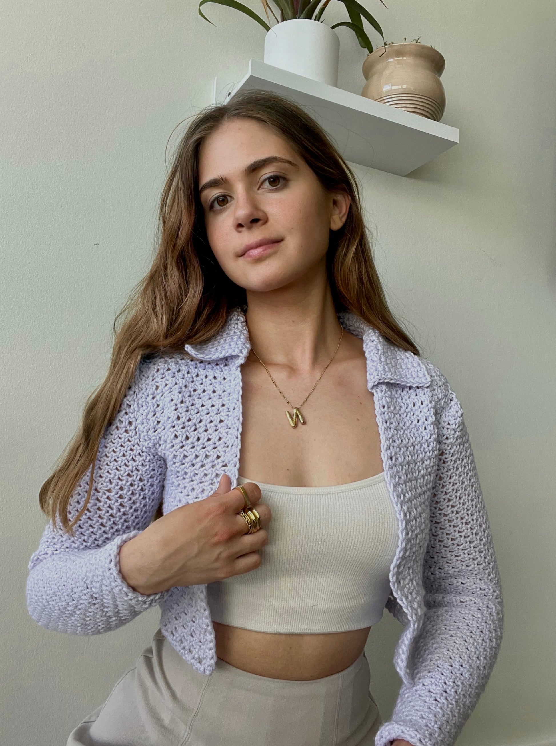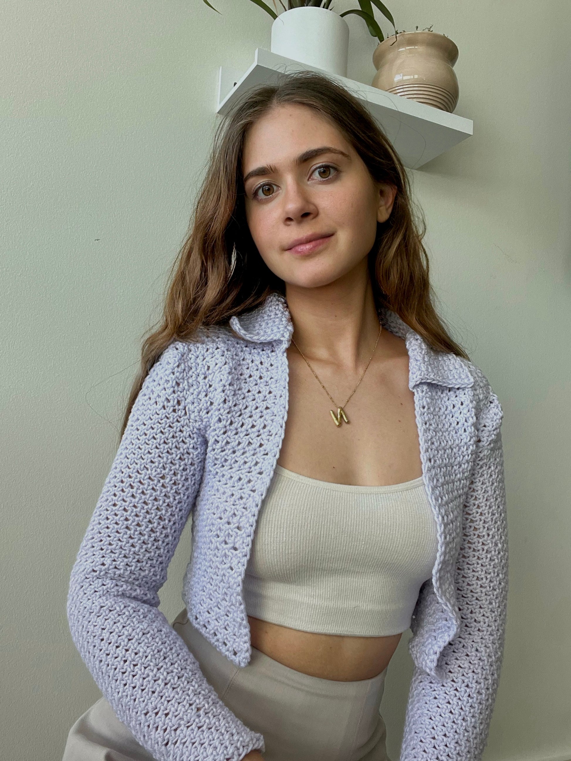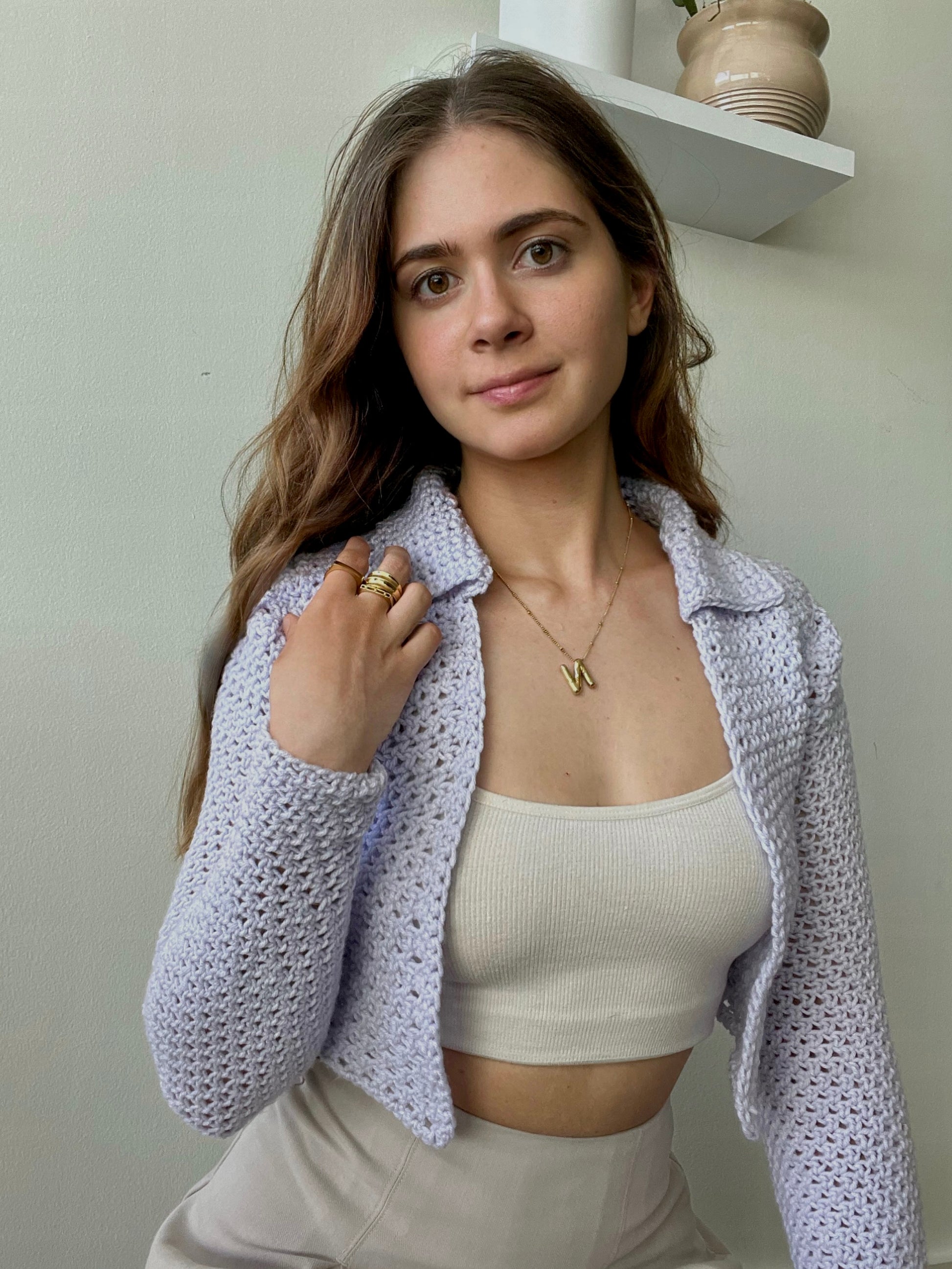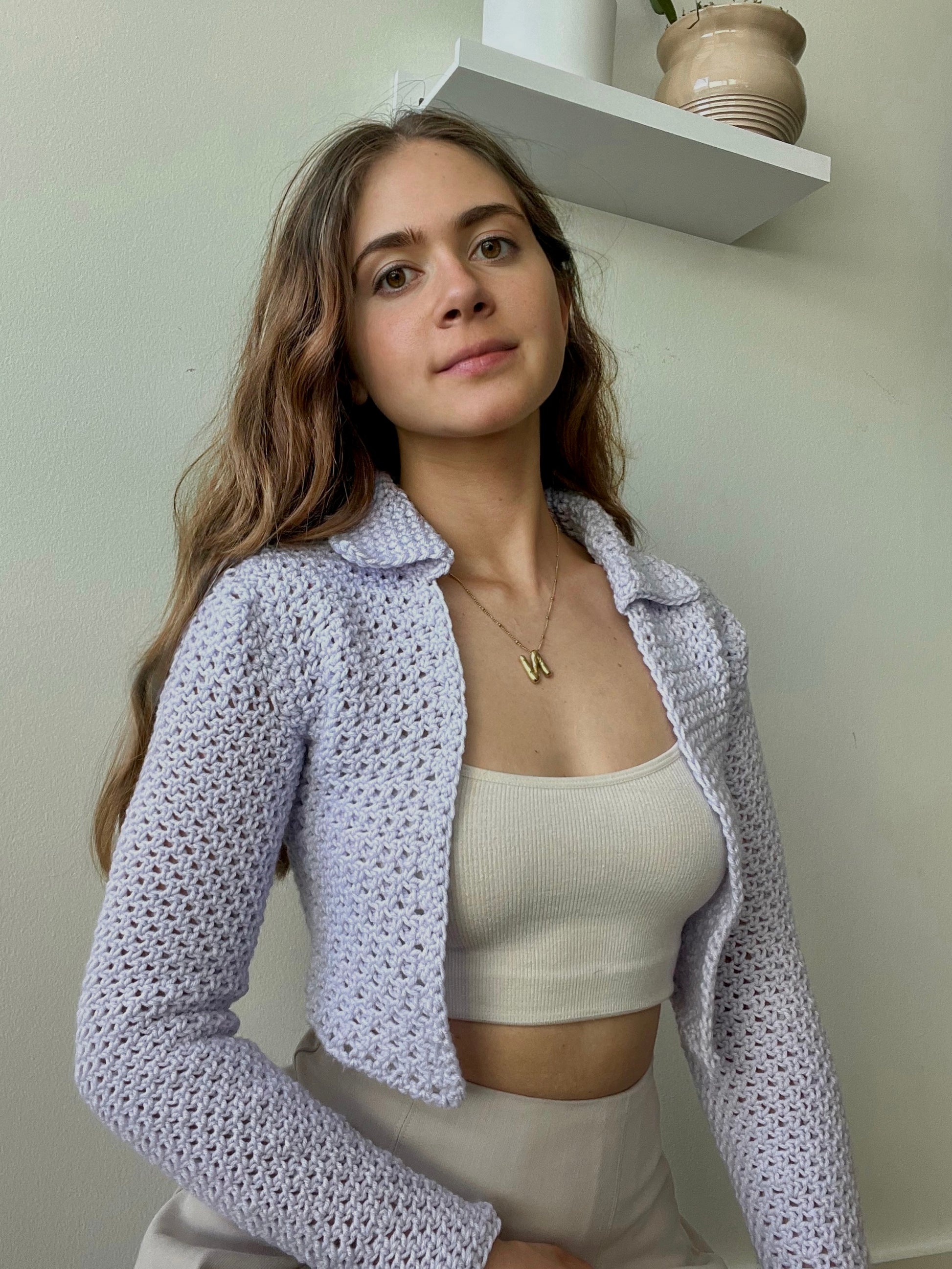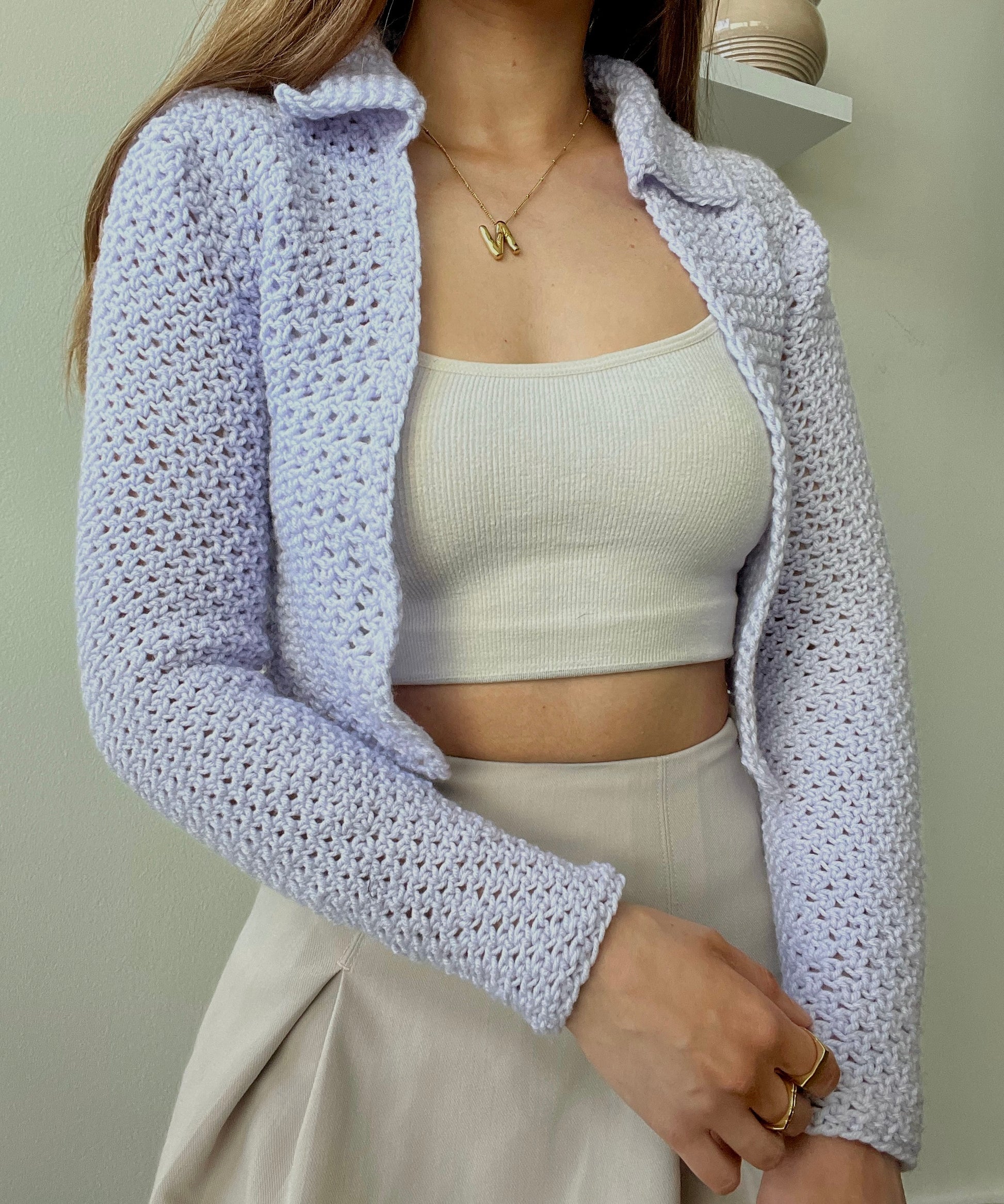 The Lyon Cardigan is a stunning crochet cropped cardigan with collar neckline and unique stitch details.