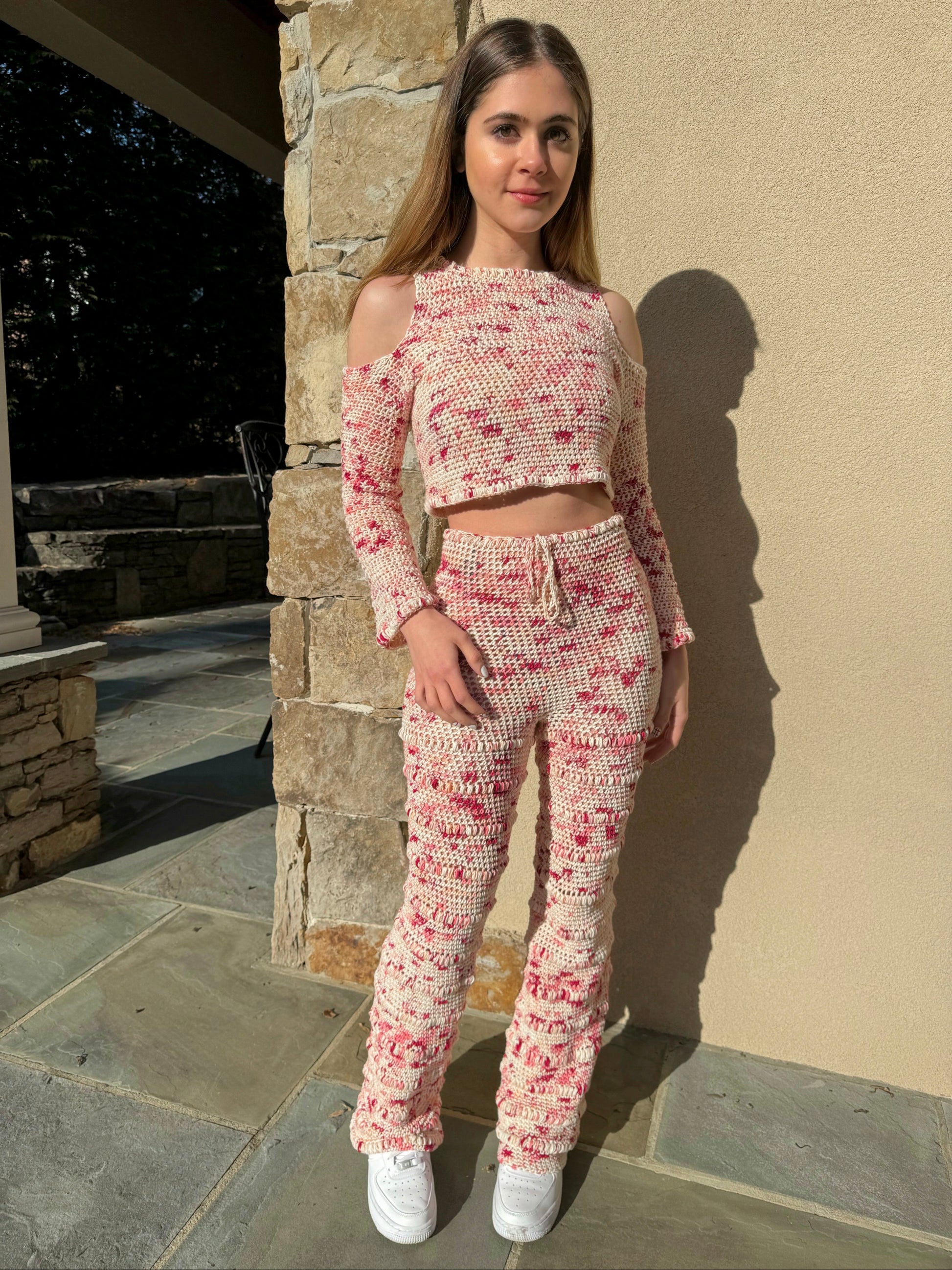 The Mara Top + Pants Set is a cozy two piece crochet set with unique stitch details. Top features shoulder cut-out sleeves and pants are high-waisted with adjustable straps!